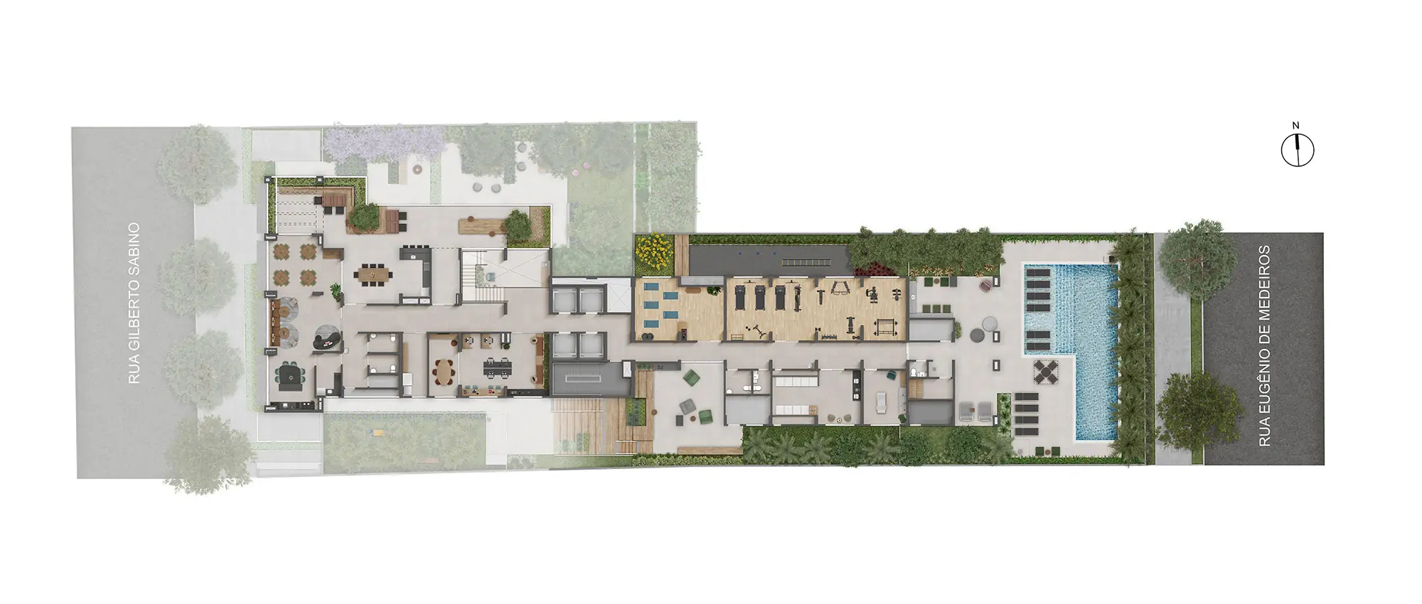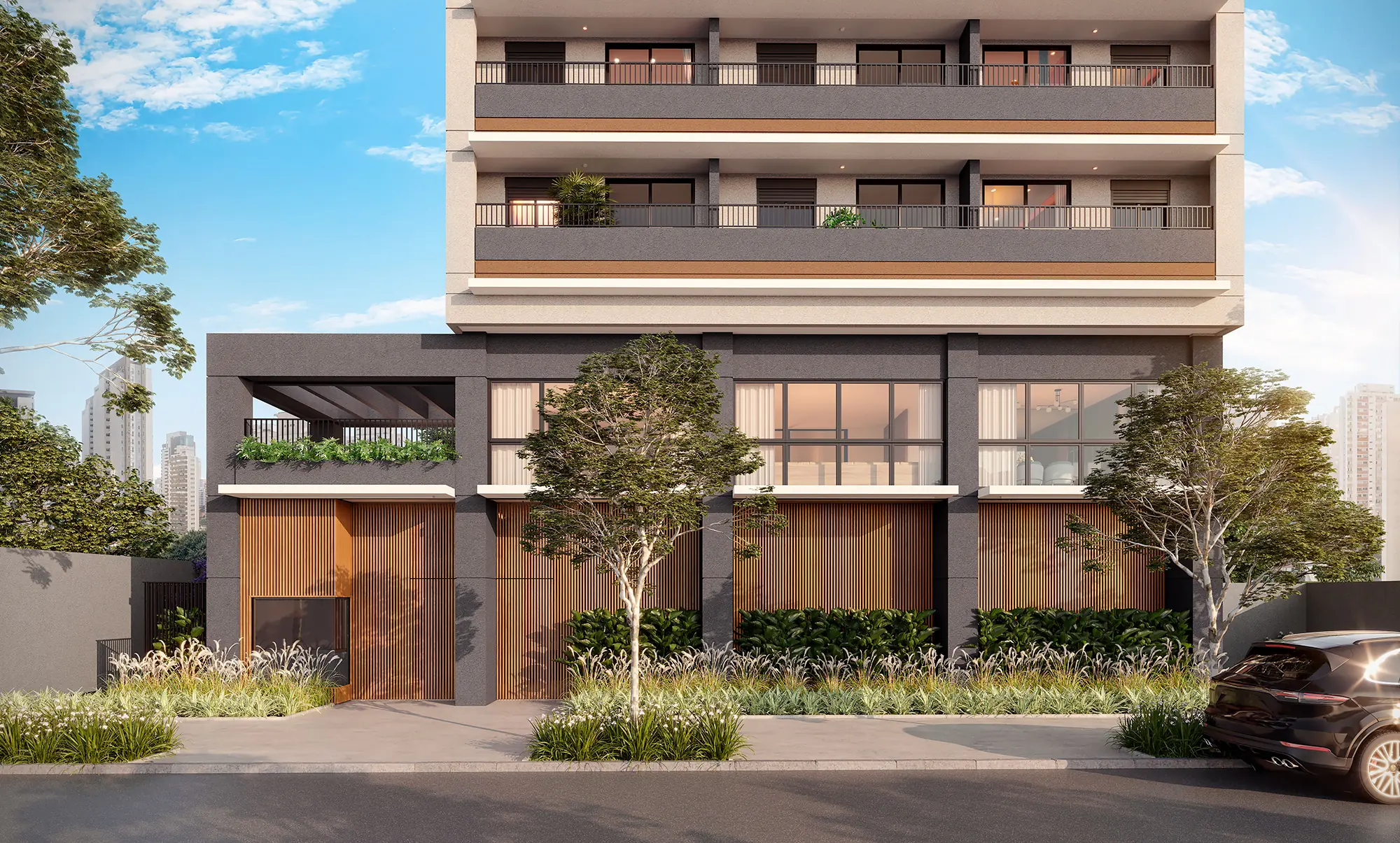 Pelas características fortes da região e do usuário final, nesse projeto buscamos sofisticação, com um design contemporâneo e atemporal, procurando integrar a arquitetura ao indivíduo estúdios + da You – que são fantásticos por conta do pé-direito generoso – e a grande novidade que será o double living com pé-direito de 5,60m, além... da vista espetacular da cidade, a partir deste ponto mais alto da rua Harmonia. Outro ponto importante do projeto é que temos o lazer distribuído ao longo da torre; criando assim um edifício ativo, que proporciona pontos de encontro entre as pessoas, sensações e percepções diferentes, que melhoram a qualidade de vida daqueles que vão usufruí-lo. Há aqui um certo conceito de hotelaria: um edifício que se abre para a cidade, com a ideia de receber as pessoas com um generoso espelho d’água e que dialoga com a paisagem. No embasamento teremos também lojas de varejo, que trazem conforto, comodidade e segurança para quem habita a região. Idealizamos um projeto com economia de materiais de fachada, já que teremos muitas aberturas, em função das vistas. Pensamos em trabalhar com desconstruções em alturas. Imaginamos também uma fenda na fachada, que rompe e conecta o edifício a partir do solo. Isso também proporciona que a gente favoreça a vista em dois vetores diferentes, como se fossem dois blocos, cada um ligeiramente voltado para uma vista – além da possibilidade de criarmos um novo diálogo com a cidade. Esse elemento será a madeira. Ela vai começar do chão e irá permear a torre inteira, passando por todos os pavimentos.” Douglas Tolaine, Design Principal do estúdio São Paulo da Perkisn&Will
